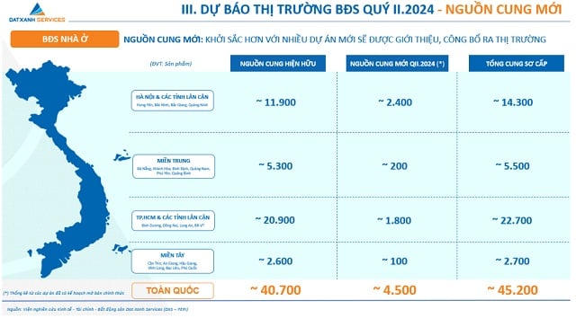 Chuyên gia DXS ước tính, nguồn cung mới tăng thêm khoảng 25% so với quý 1/2024, chủ yếu là từ các dự án đã mở bán hoặc đã khởi công trong giai đoạn trước đó. Dự kiến nguồn cung sản phẩm mới (chỉ thống kê từ các dự án đã có kế hoạch mở bán) vào khoảng 4,500 sản phẩm, đưa tổng nguồn cung tích lũy của toàn thị trường quý 2/2024 lên 45,200 sản phẩm. Nguồn cung tăng giúp cho khách hàng có thêm đa dạng sự lựa chọn, và cũng góp phần cải thiện mức hấp thụ, cũng như tình hình giao dịch chung trên thị trường.