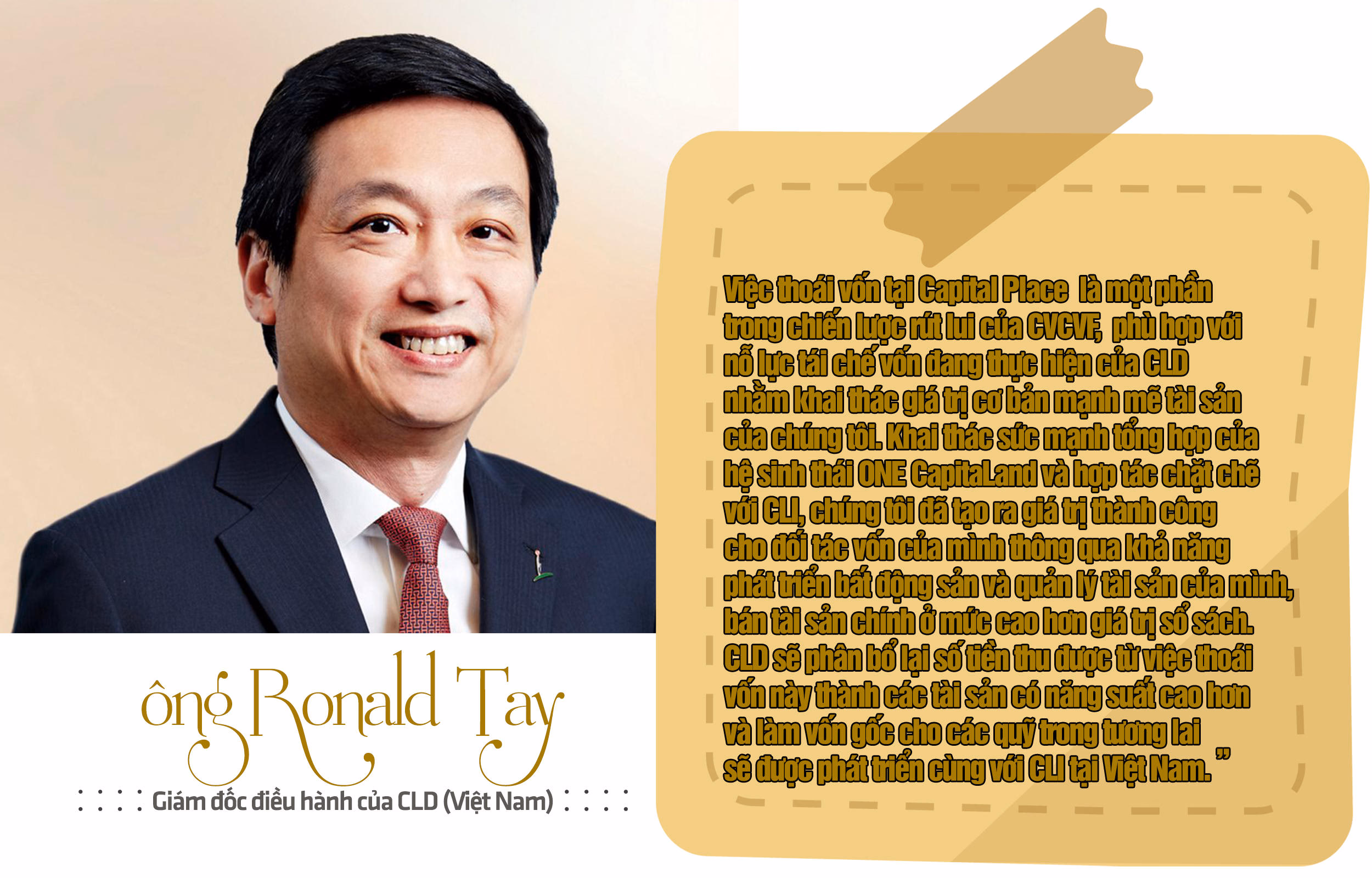 Cụ thể, theo thông tin được công bố trên trang chủ Capitaland.com, CapitaLand Development (CLD) – chi nhánh phát triển của Tập đoàn CapitaLand đã thông báo thoái vốn của Capital Place (tòa nhà văn phòng hạng A quốc tế tại Hà Nội) với giá 751 triệu đô la Singapore (550 triệu đô la Mỹ) cho một bên thứ ba không liên quan.