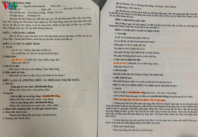 Ông Phạm Xuân Sanh, Giám đốc chi nhánh của Công ty Vinh Quang I tại Gia Lai giải thích về hợp đồng bán nhà nhưng nội dung là bán đất nền tại Dự án nhà ở Phú An.
