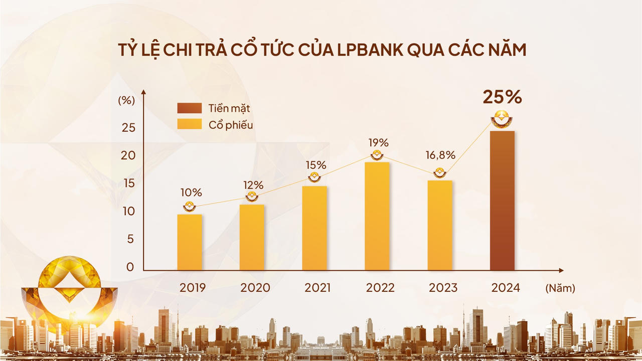 Chính sách cổ tức của LPBank luôn là một trong những yếu tố thu hút sự quan tâm đặc biệt từ các cổ đông, và tại Đại hội cổ đông thường niên 2025, chính sách này tiếp tục khẳng định những nỗ lực của Ngân hàng trong việc chia sẻ thành quả kinh doanh với các cổ đông. Theo nghị quyết được thông qua tại Đại hội, LPBank sẽ chi trả cổ tức bằng tiền mặt ở mức 25% – một trong những tỷ lệ cao nhất trên thị trường hiện nay.