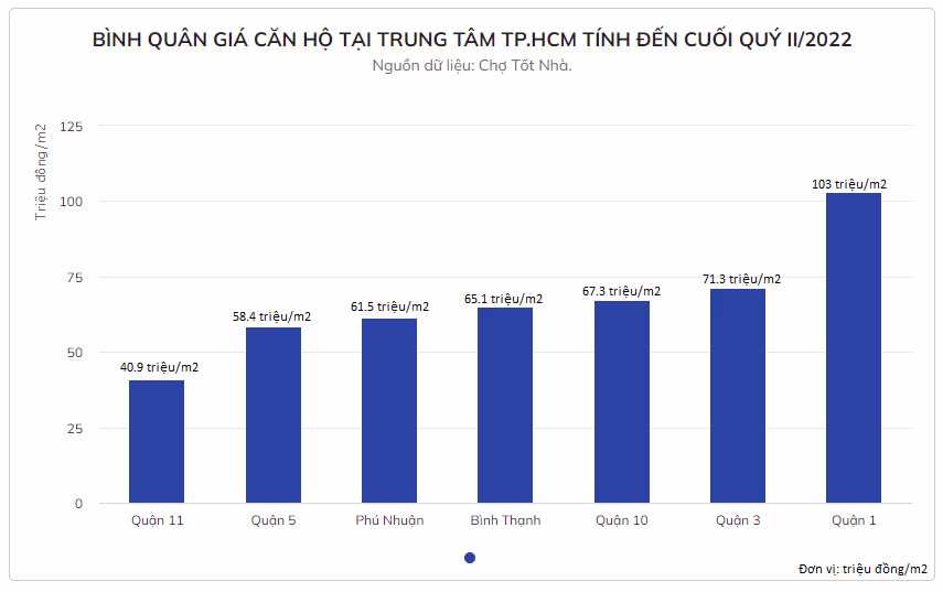 Ngoài những khu vực này, đa số quận, huyện khác chỉ có mức tăng nhẹ hoặc gần như ngang ngửa các tháng đầu năm. Nổi bật là quận 7 và quận 8 có mức giá chỉ tăng dưới 1 triệu đồng/m2 xuyên suốt quý II, với nguồn cung căn hộ dồi dào ở phân khúc giá "dễ chịu", lần lượt khoảng 44 triệu đồng/m2 và 33 triệu đồng/m2. Các căn hộ được mở bán tại quận 7 cũng tập trung quanh khoảng giá 40-60 triệu đồng/m2.