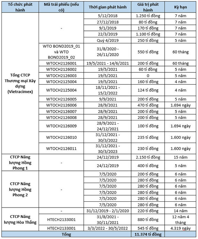 Từ tháng 12/2018 – 03/2022, Vietracimex phát hành tổng cộng 5.579 tỷ đồng trái phiếu, phần lớn được sử dụng để tài trợ cho các dự án năng lượng và bất động sản.