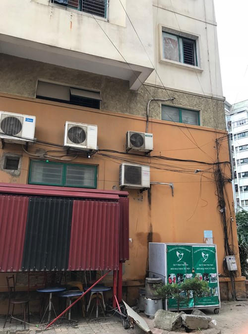 Bất cập không chỉ ở bên trong, phía bên ngoài tòa nhà, cả tầng một của tòa nhà đã được các cá nhân sử dụng để kinh doanh hàng quán ăn uống. Khu vực nấu nướng với những chiếc bếp than tổ ong khói bốc nghi ngút diễn ra ngay cạnh hệ thống dây điện chằng chịt cũ kỹ, tiềm ẩn nguy cơ cao xảy ra cháy nổ. Hoạt động kinh doanh buôn bán này ảnh hưởng rất lớn đến sức khỏe, đời sống sinh hoạt hàng ngày của các hộ dân phía bên trên.