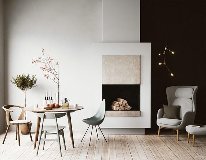 Mẫu phòng ăn rất đơn giản và khác lạ dù chỉ vài chiếc ghế, cây, lò sưởi.