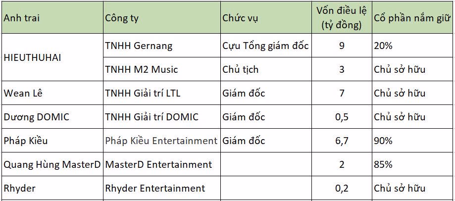 Nhiều nghệ sĩ tham gia chương trình Anh trai say hi đã lập công ty riêng với vốn điều lệ lên đến hàng tỷ đồng và đảm nhận vị trí giám đốc.