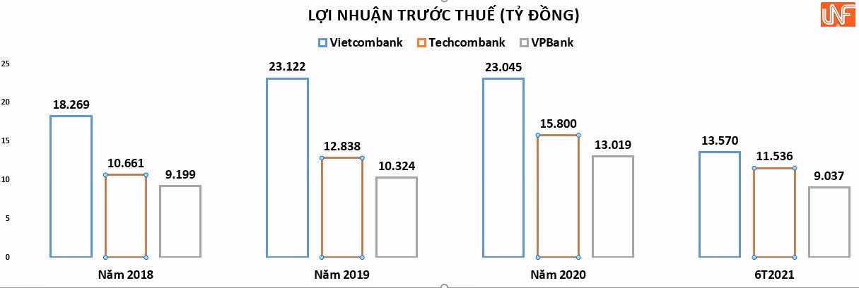 Nếu như năm 2018 - 2019, lợi nhuận tại Techcombank và lợi nhuận tại VPBank cộng lại mới gần bằng Vietcombank thì năm 2020, lợi nhuận tại hai nhà băng này cộng lại (gần 29.000 tỷ đồng) đã vượt qua rất xa lợi nhuận Vietcombank (23.045 tỷ đồng). Thậm chí, nửa đầu năm 2021, Techcombank đang bám sát Vietcombank về lợi nhuận với hơn 11.500 tỷ đồng, trong khi Vietcombank đạt hơn 13.500 tỷ đồng.