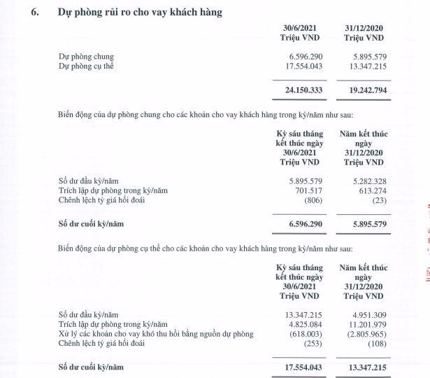 Về dự phòng rủi ro cho khách hàng, tại thời điểm 30/6/2021, Vietcombank có trích lập hơn 24.000 tỷ đồng. tăng 26% so với đầu năm. Trong đó, đáng chú ý, dự phòng cụ thể đạt 17.554 tỷ đồng, tăng 32%. Nó cho thấy, Vietcombank đã trích lập dự phòng rủi ro cụ thể khá mạnh.