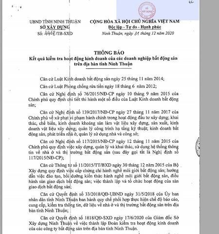 Văn bản kết quả kiểm tra hoạt động kinh doanh của các doanh nghiệp BĐS trên địa bàn tỉnh Ninh Thuận.