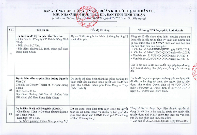 Sở Xây dựng Ninh Thuận vừa ra văn bản số 2214 thông báo về hiện trạng đầu tư, tình hình cho phép chuyển nhượng bất động sản của các dự án khu đô thị, khu dân cư, khu nhà ở trên địa bàn tỉnh.