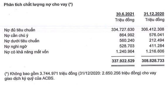Cụ thể, nếu không tính gần 3.745 tỷ đồng từ cho vay giao dịch ký quỹ của ACBS, tổng nợ xấu của ACB tính đến cuối quý 2/2021 tăng 27% so với đầu năm, lên mức gần 2.330 tỷ đồng. Trong đó, nợ nhóm 3 tăng vọt 164% lên mức 560 tỷ đồng; nợ nhóm 4 cũng tăng 29% lên gần 529 tỷ đồng; nợ nhóm 5 tăng nhẹ 2% ở mức gần 1.241 tỷ đồng. Do đó, tỷ lệ nợ xấu trên dư nợ vay nhích nhẹ từ 0,6% hồi đầu năm lên 0,69%.