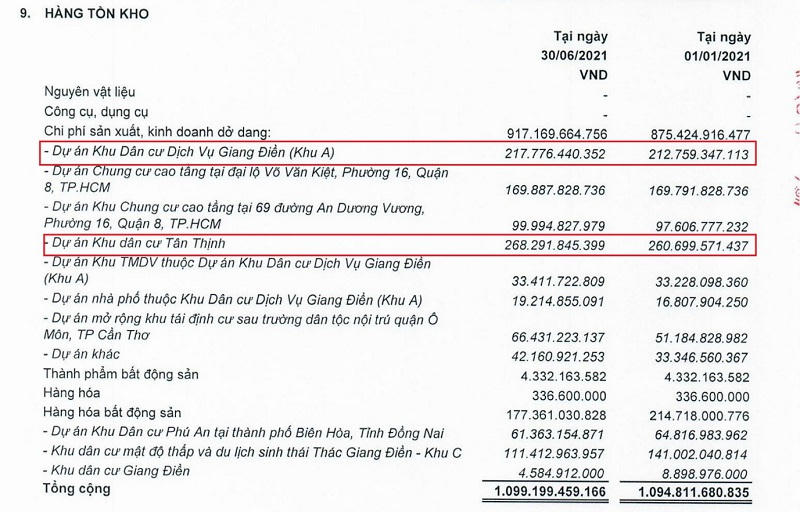 Tính đến 30/06/2021, tổng tài sản của LDG ghi nhận hơn 6,506 tỷ đồng, tăng 18% so với đầu năm. Hàng tồn kho ghi nhận tăng nhẹ, lên hơn 1,099 tỷ đồng. Trong đó, chi phí sản xuất kinh doanh dở dang chiếm 83% tổng giá trị hàng tồn kho với hơn 268 tỷ đồng đến từ dự án Khu Dân cư Tân Thịnh và 218 tỷ đồng từ dự án Khu Dân cư Dịch vụ Giang Điền (Khu A).
