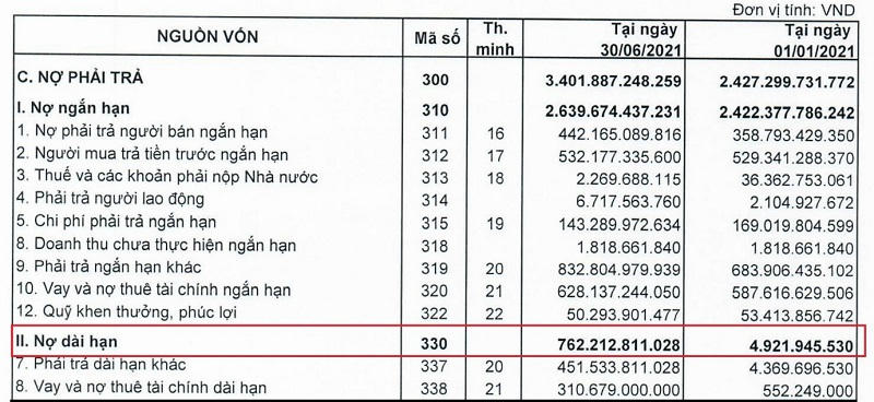 Đồng thời, kết thúc Quý 2/2021 nợ phải trả của LDG cũng ghi nhận tăng đột biến khoảng 40 % so với thời điểm đầu năm. Cụ thể, tính đến ngày 30/6/2021 nợ phải trả của doanh nghiệp là hơn 3.400 tỷ đồng trong khi thời điểm đầu năm là hơn 2.400 tỷ (tức tăng khoảng 1.000 tỷ đồng). Trong đó khoản nợ ngắn hạn không có nhiều biến động (khoảng 2.600 tỷ), riêng khoản nợ dài hạn thì có sự tăng mạnh lên hơn 762 tỷ đồng, so với đầu năm con số này chỉ là gần 5 tỷ đồng.