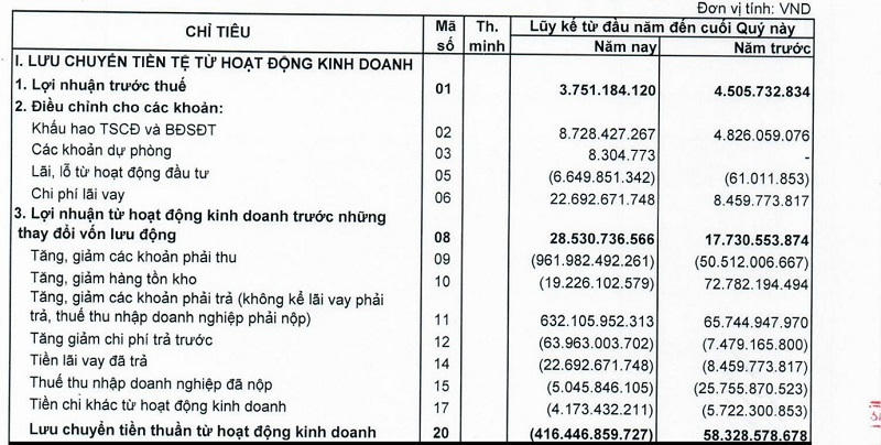 Với việc các khoản phải thu và phải trả của LDG lần lượt tăng 962 tỷ đồng và 632 tỷ đồng dẫn đến dòng tiền kinh doanh của doanh nghiệp âm hơn 416 tỷ đồng, trong khi cùng kỳ năm ngoái con số này là 58 tỷ đồng.