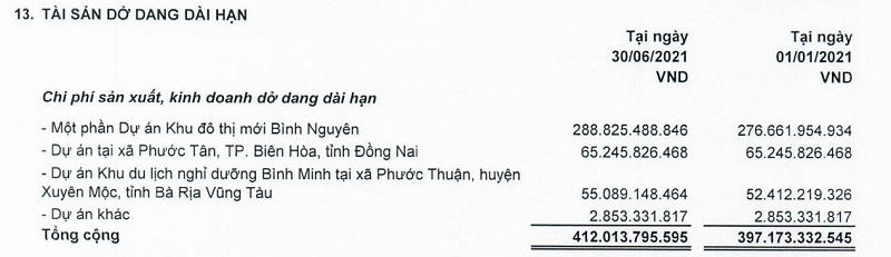Tài sản dở dang dài hạn tại ngày 30/6/2021 của LDG có giá trị 412 tỷ đồng, chủ yếu là chi phí tại khu đô thị mới Bình Nguyên (289 tỷ đồng); dự án Phước Tân, Biên Hòa (65 tỷ đồng) và khu du lịch Bình Minh, Bà Rịa – Vũng Tàu (55 tỷ đồng).