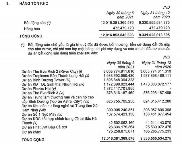 Theo phần thuyết minh báo cáo tài chính, hàng tồn kho chủ yếu tập trung ở một số dự án như The EverRich 2 (gần 3.604 tỷ đồng), dự án Khu du lịch Bến Thành - Long Hải (1.988 tỷ đồng), dự án Bình Dương Tower (gần 1.596 tỷ đồng), dự án Khu đô thị Sinh thái Nhơn Hội (1.173 tỷ đồng), dự án Phước Hải (1.372 tỷ đồng), dự án The EverRich 3 (876,6 tỷ đồng),…