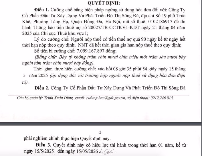 Chi Cục thuế Khu vực I vừa có quyết định về việc cưỡng chế thi hành quyết định hành chính về quản lý thuế bằng biện pháp ngừng sử dụng hoá đơn đối với CTCP Đầu tư xây dựng và Phát triển đô thị Sông Đà (gọi tắt Đô thị Sông Đà). Địa chỉ công ty tại số 19 Phố Trúc Khuê, phường Láng Hạ, quận Đống Đa, TP Hà Nội.