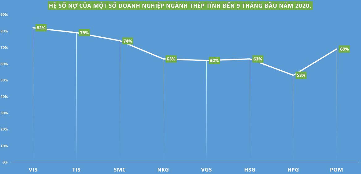 Cụ thể, tính đến hết quý 3/2020, CTCP Gang thép Thái Nguyên (mã TIS) có hệ số nợ lên tới 79,4%; Tập đoàn Hòa Phát (mã HPG) với 53,2%; CTCP thép Nam Kim (NKG) với 63%; CTCP thương mại SMC với 74%; CTCP ống thép Việt Đức (VGS) với 62% và cao nhất tại CTCP thép Việt Ý (VIS) có hệ số nợ lên tới 82%.