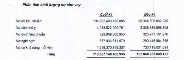 Tương tự tại VietBank, trong khi nợ nhóm 3 và nhóm 4 giảm lần lượt 34%, 28% so với đầu năm thì nợ nhóm 5 lại tăng tới hơn 99%.