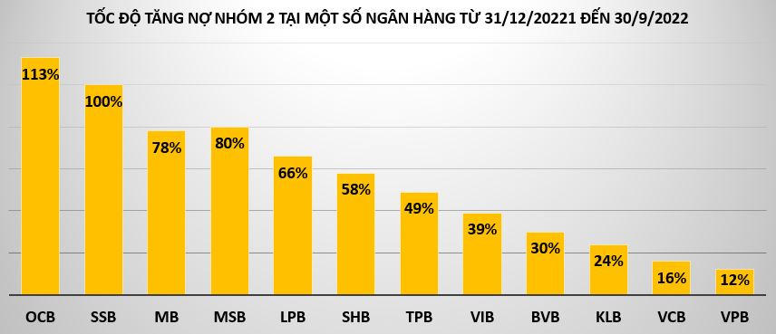 Mặc dù vậy, tính đến hết quý 3/2022, nợ nhóm 2 (nợ cần chú ý) lại tăng khá mạnh so với đầu năm, một phần nguyên nhân là Thông tư 14/2021/TT-NHNN về cơ cấu lại thời hạn trả nợ, miễn, giảm lãi, phí, giữ nguyên nhóm nợ nhằm hỗ trợ khách hàng chịu ảnh hưởng bởi dịch Covid-19 hết hiệu lực từ cuối quý 2/2022. Đây là nhóm nợ có xu hướng sẽ trở thành nợ xấu trong điều kiện không thanh toán được đúng hạn các khoản vay.