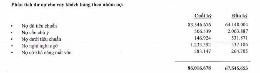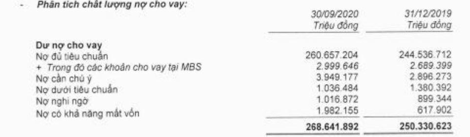 Chẳng hạn tại MBB, kết thúc 9 tháng đầu năm, tổng nợ xấu đạt 4.036 tỷ đồng, tăng 39% so với hồi đầu năm. Trong đó, nợ nhóm 3 ở mức 1.036 tỷ đồng, giảm 25% so với hồi đầu năm. Tuy nhiên, nợ nhóm 4 tăng 13%, lên mức 1.017 tỷ đồng và đặc biệt nợ nhóm 5 tăng tới 221% lên mức 1.982 tỷ đồng.