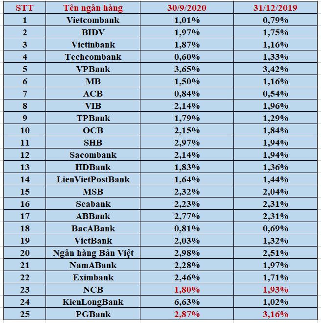 Thực tế, nợ xấu ngân hàng tăng mạnh hơn tốc độ tăng trưởng tín dụng rất nhiều. Do đó, kéo theo tỷ lệ nợ xấu trên dư nợ vay tăng cao theo. Kết thúc 9 tháng đầu năm, KLB có tỷ lệ nợ xấu cao nhất hệ thống ngân hàng với 6,63%, tiếp theo là VPBank (3,65%). Ngoài ra, có hai ngân hàng có tỷ lệ nợ xấu gần 3% là PGBank (2,87%) và ngân hàng Bản Việt (2,98%).