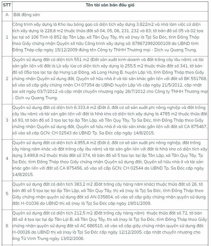 Cụ thể, đợt đấu giá gồm 25 tài sản. Trong đó có 21 quyển sử dụng đất tại xã Tân Quy Tây, thành phố Sa Đéc, tỉnh Đồng Tháp với diện tích từ 196 m2 tới 6.333 m2. Các khu đất này phần lớn là đất nông nghiệp để trồng cây và đất ở vùng nông thôn.