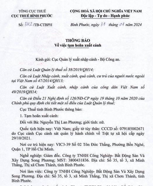 Cục Thuế tỉnh Bình Phước đã có văn bản gửi Cục Quản lý xuất nhập cảnh Bộ Công an về việc đề nghị tạm hoãn xuất cảnh đối với bà Nguyễn Thị Lan Phương, Giám đốc Công ty TNHH Công nghiệp - Bất động sản và Xây dựng Song Phương, chủ đầu tư Dự án Khu dân cư Phước Thắng (tên thương mại Dự án Amira Chơn Thành).