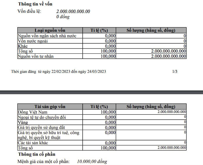 Người đại diện theo pháp luật là Nguyễn Tấn Minh, chức vụ Chủ tịch HĐQT. Vốn điều lệ của công ty là 2.000 tỷ đồng. Cổ đông góp vốn không được đề cập. Tại ngày đăng ký thay đổi ngày 22/2/2023, công ty cập nhật vốn điều lệ là 33,872 tỷ đồng.