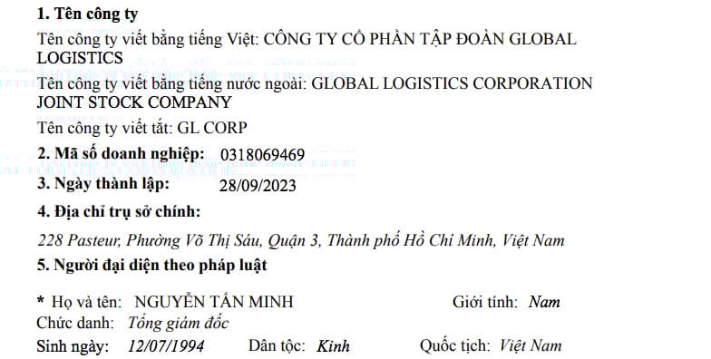 Về cổ đông lớn là Công ty cổ phần Tập đoàn Global Logistics, doanh nghiệp này được thành lập ngày 28/9/2023, địa chỉ trụ sở tại 228 Pasteur, phường Võ Thị Sáu, quận 3, TP. HCM.