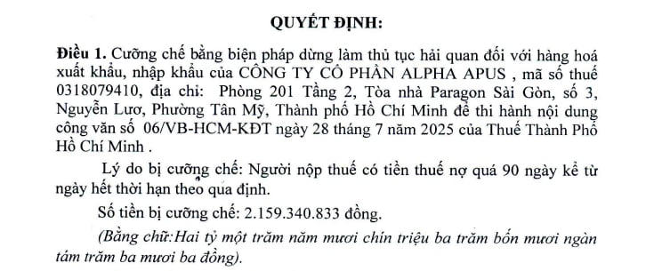 Công ty cổ phần Alpha Apus bị cưỡng chế dừng làm thủ tục hải quan đối với hàng hóa xuất khẩu, nhập khẩu do nợ thuế hơn 2 tỷ đồng.