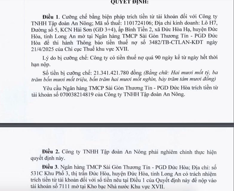 Công ty TNHH Tập đoàn An Nông bị Chi Cục thuế Khu vực XVII cưỡng chế bằng biện pháp trích tiền thuế do nợ tiền thuế quá 90 ngày. Số tiền bị cưỡng chế hơn 21,34 tỷ đồng.