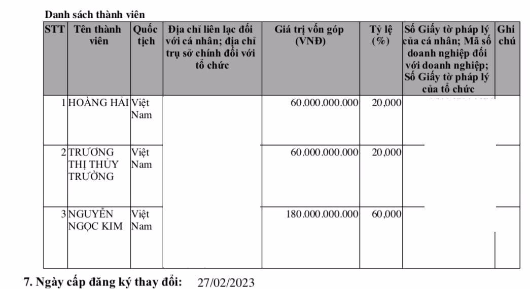 Tại ngày cấp đăng ký thay đổi ngày 21/11/2022, công ty nâng vốn điều lệ từ 30 lên 300 tỷ đồng. Thành viên góp vốn gồm: Hoàng Hải góp 60 tỷ đồng (tỷ lệ 20%); Trương Thị Thuỷ Trường góp 60 tỷ đồng (tỷ lệ 20%) và Nguyễn Ngọc Kim góp 180 tỷ đồng (tỷ lệ 60%).
