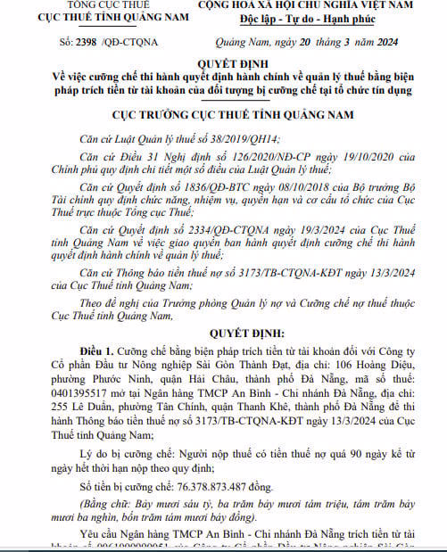 Đồng thời, cưỡng chế bằng biện pháp trích tiền từ tài khoản của Công ty Cổ phần Đầu tư Nông nghiệp Sài Gòn Thành Đạt mở tại Ngân hàng TMCP An Bình - Chi nhánh Đà Nẵng.