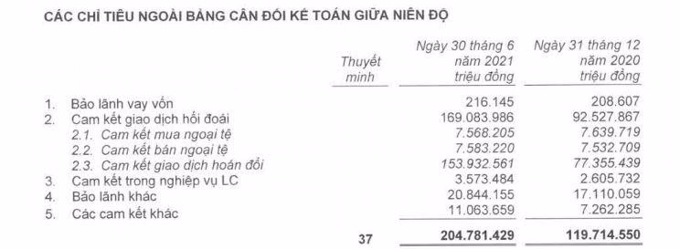 Cụ thể, tiểu mục cam kết giao dịch hối đoái ghi nhận 169.083 tỷ đồng, tăng vọt 82% so với thời điểm năm 31/12/2020; mục Bảo lãnh khác cũng tăng 22% lên 20.844 tỷ đồng;...