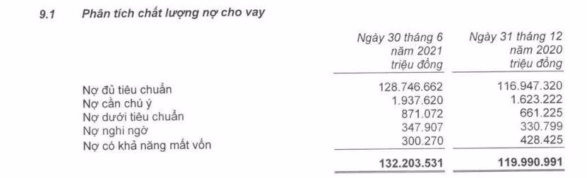 Tính đến ngày 30/06/2021, tổng nợ xấu của TPBank tăng 7% so với đầu năm, lên mức 1.519 tỷ đồng. Trong cơ cấu nợ của TPBank, nợ có khả năng mất vốn (nợ nhóm 5) giảm 30% về mức 300 tỷ đồng. Nợ nghi ngờ lại tăng nhẹ 5% lên gần 348 tỷ đồng. Đáng chú ý, nợ dưới tiêu chuẩn (nợ nhóm 3) lại tăng 32%, lên hơn 871 tỷ đồng.