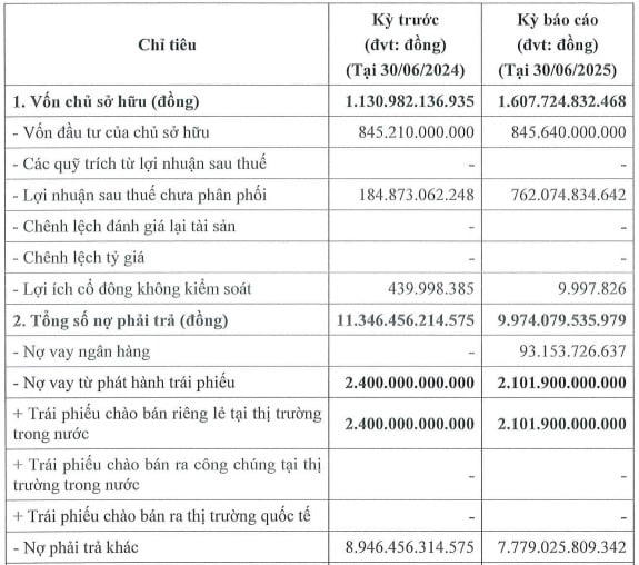 Tổng nợ phải trả giảm khoảng 1.300 tỷ đồng so với cùng kỳ còn 9.974 tỷ đồng và gấp 6,2 lần vốn chủ sở hữu. Trong đó, dư nợ trái phiếu giảm 300 tỷ đồng xuống còn 2.102 tỷ đồng; nợ phải trả khác giảm gần 1.200 tỷ đồng về còn 7.780 tỷ đồng và phát sinh khoản vay ngân hàng 93 tỷ đồng.