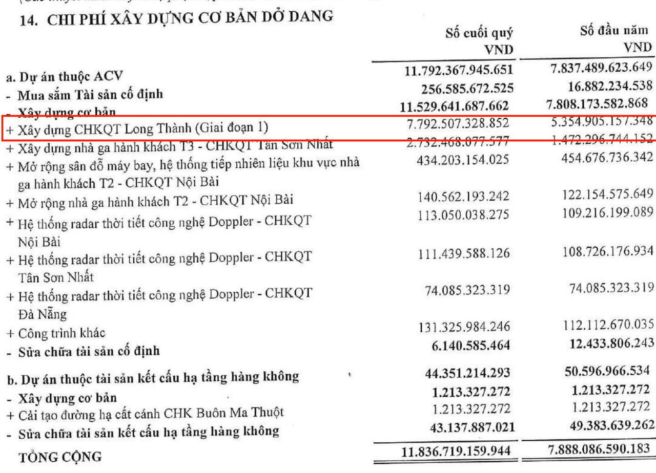 Ngoài ra, việc thực hiện các dự án trọng điểm của ngành hàng không cũng khiến chi phí xây dựng cơ bản dở dang của ACV tăng hơn 50% so với đầu năm lên 11.837 tỷ đồng, tập trung chủ yếu vào xây dựng CHKQT Long Thành (giao đoạn 1) là 7.792 tỷ đồng, tăng 45,5% so với cùng kỳ năm ngoái.