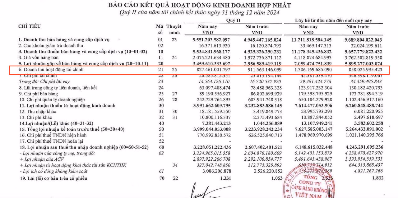 Luỹ kế 6 tháng đầu năm, ACV đem về 11.178 tỷ đồng doanh thu thuần, lãi sau thuế đạt 6.149 tỷ đồng, tăng lần lượt 16% và 44% so với năm 2023. Sau nửa năm, ACV hoàn thành 56% chỉ tiêu doanh thu và 81% mục tiêu lợi nhuận năm.