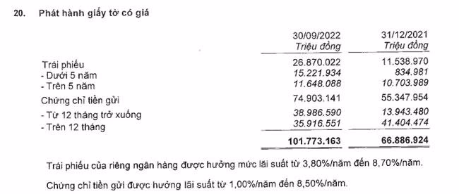 Song song với việc đầu tư trái phiếu, MBBank cũng là một trong TMCP dẫn đầu về phát hành trái phiếu. Cuối quý 3/2022, MBBank phát hành nhiều lô trái phiếu với tổng giá trị 26.870 tỷ đồng, cao gấp hơn 2,3 lần so với mức 11.539 tỷ đồng hồi đầu năm. Trong đó, trái phiếu có kỳ hạn dưới 5 năm có giá trị gần 15.222 tỷ đồng; Trái phiếu có kỳ hạn trên 5 năm 11.648 tỷ đồng. Các lô trái phiếu này có lãi suất dao động từ 3,8 – 8,7%/năm.