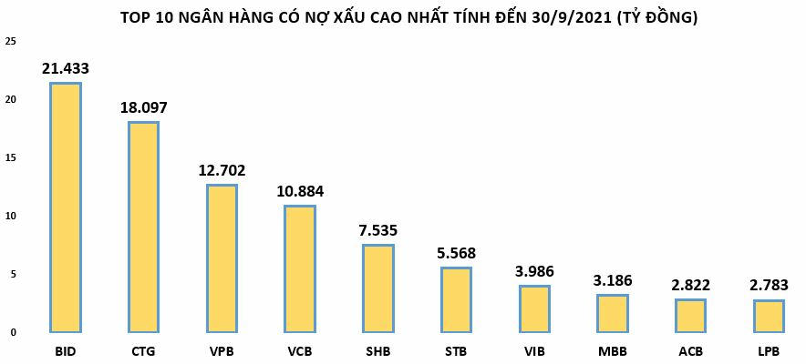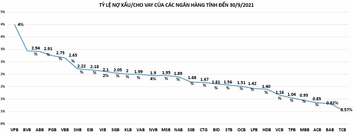 Xét về tỷ lệ nợ xấu/dư nợ cho vay, hầu hết các ngân hàng đều tăng. Cụ thể, tỷ lệ nợ xấu/dư nợ tại VIB tăng từ 1,74% hồi đầu năm lên 2,12% tại thời điểm 30/9/2021; Techcombank từ 0,47% lên 0,57%; ACB từ 0,60% lên 0,85%; Vietcombank từ 0,62% lên 1,16%.