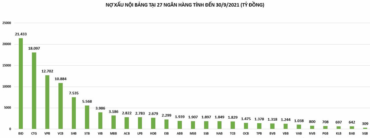 Tổng nợ xấu tại 27 ngân hàng chiếm hơn 110.000 tỷ đồng, tăng 26% so với đầu năm. Trong đó, 8 ngân hàng công bố nợ xấu giảm so với đầu năm nhưng tỷ lệ lại rất thấp, chưa tới 10% so với đầu năm như: MBBank giảm nhẹ 2% ghi nhận 3.186 tỷ đồng; TPBank giảm 3% ghi nhận 1.378 tỷ đồng; OCB giảm 2% xuống còn 1.475 tỷ đồng; Sacombank giảm 3,5% ghi nhận 5.568 tỷ đồng; VietABank giảm gần 7% xuống còn 1.038 tỷ đồng;…