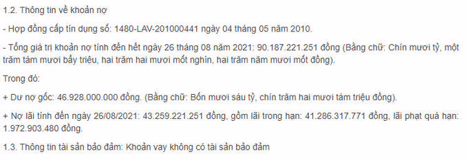 + Nợ lãi tính đến ngày 26/08/2021: 43.259.221.251 đồng, gồm lãi trong hạn: 41.286.317.771 đồng, lãi phạt quá hạn: 1.972.903.480 đồng.