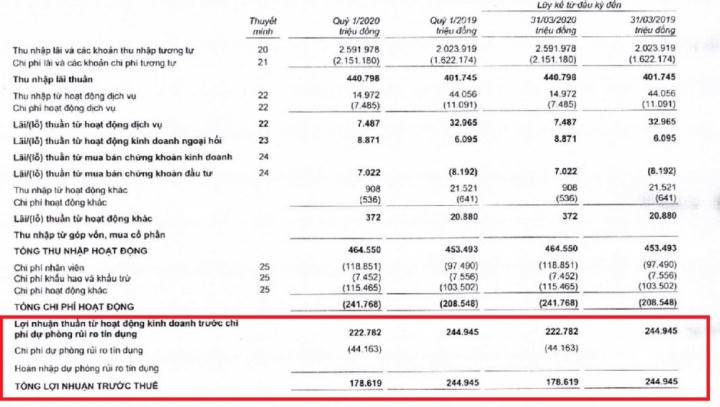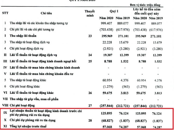 Do đó, Kienlongbank đột ngột tăng trích lập chi phí dự phòng rủi ro tín dụng gấp 37 lần so với cùng kỳ năm 2019, chiếm gần 69 tỷ đồng. Đó là nguyên nhân khiến lợi nhuận trước thuế và sau thuế cùng giảm 23% so với cùng kỳ năm trước, còn hơn 57 tỷ đồng và 46 tỷ đồng.