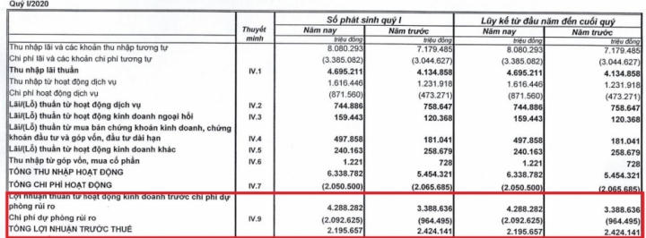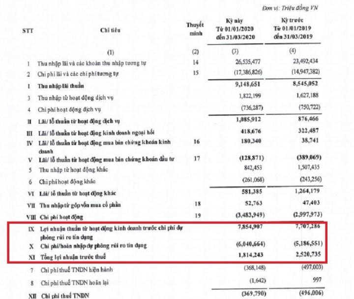 Dựa vào báo cáo tài chính quý I/2020, lợi nhuận ở nhiều ngân hàng sụt giảm so với cùng kỳ năm trước, nợ xấu tăng vọt. Vì vậy, ngân hàng buộc phải tăng mạnh trích lập dự phòng rủi ro. Việc này khiến lợi nhuận ngân hàng bị "ăn mòn".