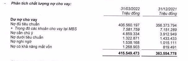 Tuy nhiên, xét về chất lượng nợ vay lại không mấy khả quan khi tổng nợ xấu tại MB tính đến 31/3/2022 tăng tới 26% so với đầu năm. Trong đó, nợ dưới tiêu chuẩn giảm nhẹ 8% ghi nhận gần 1.323 tỷ đồng nhưng nợ nghi ngờ lại tăng tới 52% lên hơn 1.538 tỷ đồng và nợ có khả năng mất vốn cũng tăng tới 55% lên gần 1.269 tỷ đồng. Do đó, đẩy tỷ lệ nợ xấu trên dư nợ vay của MB từ 0,9% hồi đầu năm lên 0,99%.