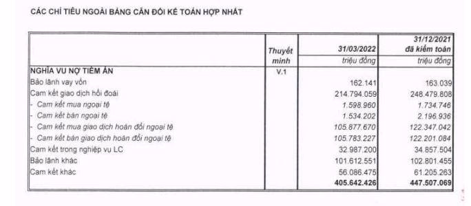 Đáng nói, ngoài khối nợ xấu trên, ngân hàng MB còn đang ‘sở hữu’ hơn 134.761 tỷ đồng nghĩa vụ nợ tiềm ẩn nằm ngoài bảng cân đối kế toán. Trong đó, cam kết bảo lãnh vay vốn ghi nhận hơn 162 tỷ đồng; cam kết trong nghiệp vụ L/C (bảo lãnh qua thư tín dụng) ghi nhận 32.987 tỷ đồng và cam kết trong bảo lãnh khác ghi nhận 101.612 tỷ đồng. Các khoản nợ này được phát sinh khi ngân hàng và khách hàng ký các cam kết tín dụng, hạn mức thấu chi chưa sử dụng hoặc thư tín dụng….