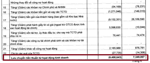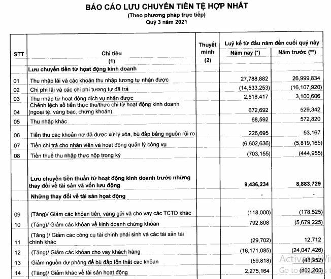 Tại Sacombank, dòng tiền thuần từ hoạt động kinh doanh trong 9 tháng đầu năm 2021 âm hơn 6.498 tỷ đồng trong khi cùng kỳ 2020 dương 7.349 tỷ đồng; dòng tiền thuần từ hoạt động đầu tư dương gần 149 tỷ đồng (cùng kỳ 2020 âm hơn 318 tỷ đồng); dòng tiền thuần từ hoạt động tài chính dương gần 2.435 tỷ đồng. Tuy nhiên, tổng lưu chuyển tiền thuần trong kỳ vẫn âm hơn 3.915 tỷ đồng trong khi cùng kỳ 2020 dương 7.030 tỷ đồng.