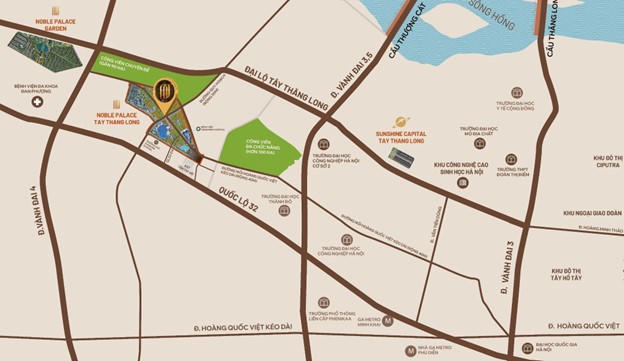 Chính vì vậy, Noble Palace Tay Thang Long đang trở thành “hàng hiếm” khi tọa lạc tại “tứ giác vàng” tạo nên nhờ sự giao cắt hoàn hảo của 4 trục đường huyết mạch là Đại lộ Tây Thăng Long, Quốc lộ 32, Vành đai 4 và Vành đai 3.5 (trong bán kính chỉ khoảng 1km-2km) cùng lợi thế phong thuỷ trên trục thần đạo Hồ Tây - Ba Vì.