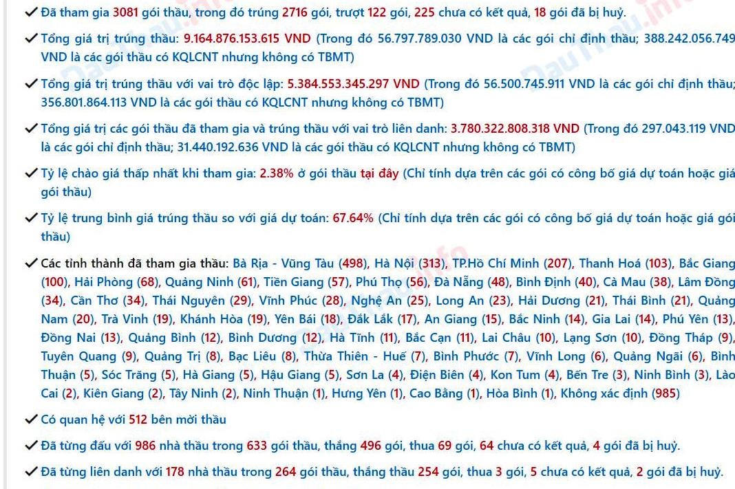 Theo kết quả trên hệ thống đấu thầu Quốc gia, khoảng 5 năm trở lại nay doanh nghiệp này đã tham gia dự thầu 3079 gói thầu (trong đó trúng 2714 gói, 225 gói thầu chưa công bố kết quả). Tống giá trị trúng thầu hơn 9.157,4 tỷ đồng. Tỷ lệ trung bình giá trúng thầu so với giá dự toán 67.65% (Chỉ tính dựa trên các gói có công bố giá dự toán hoặc giá gói thầu).