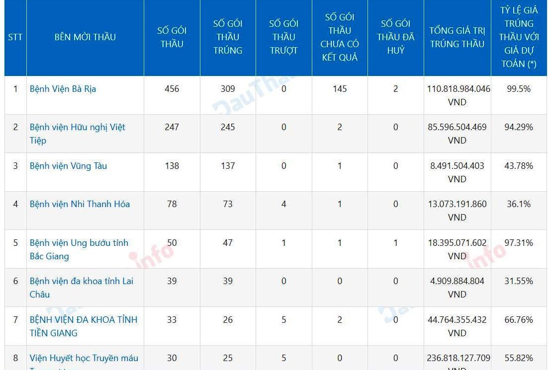 Cụ thể, tại Bệnh viện Bà Rịa, Công ty TNHH Thiết bị Minh Tâm đã tham gia dự thầu 456 gói thầu cung cấp vật tư, hoá chất, thiết bị y tế tại bệnh viện này và đã trúng 309 gói thầu (145 gói chưa có kết quả) với tổng trị giá trúng thầu hơn 110,8 tỷ đồng (tỷ lệ trúng thầu 99.5% - PV).